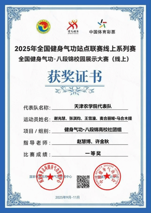 近日,2025年全国健身气功·八段锦校园展示大赛(线上)传来喜讯,由我校体育教学部赵慧博、许金秋两位教师指导,谢光慧、张淇钧、王雪潼、麦合丽娅·马合木提四位同学组成的代表队表现优异,在高校社团组的激烈竞争中脱颖而出,斩获一等奖,充分展现了我校学子扎实的功底与昂扬的精神风貌。