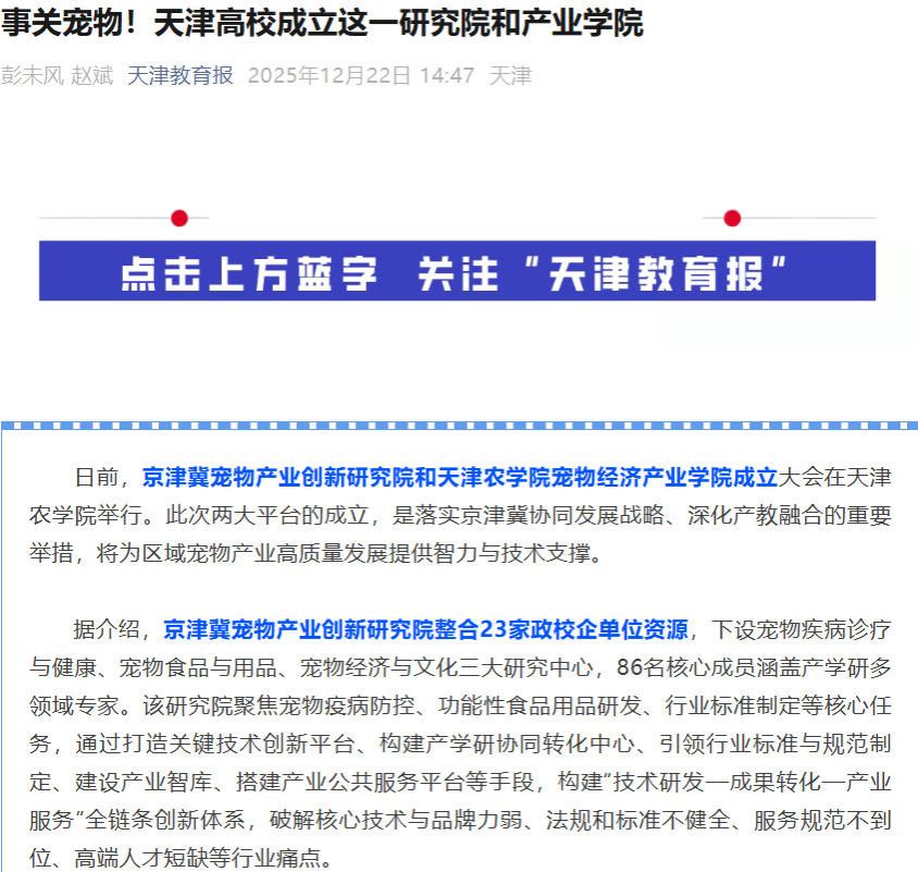 2025年12月22日,天津教育报公众号报道京津冀宠物产业创新研究院和金沙集团1862cc成色宠物经济产业学院成立大会在金沙集团1862cc成色举行。