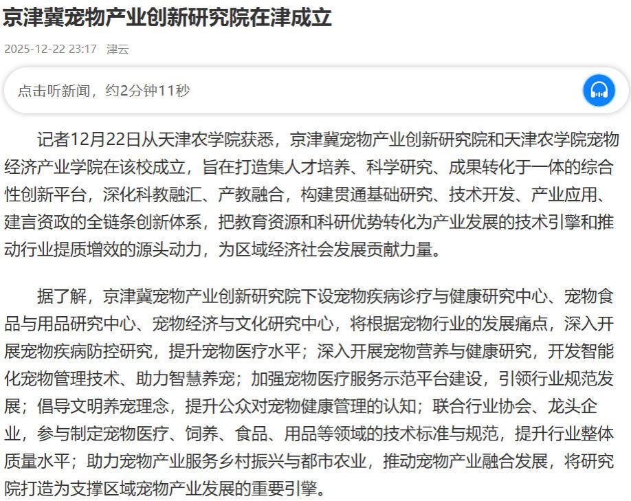 2025年12月22日,津云报道京津冀宠物产业创新研究院在京津冀宠物产业创新研究院和金沙集团1862cc成色宠物经济产业学院在我校成立,旨在打造集人才培养、科学研究、成果转化于一体的综合性创新平台。